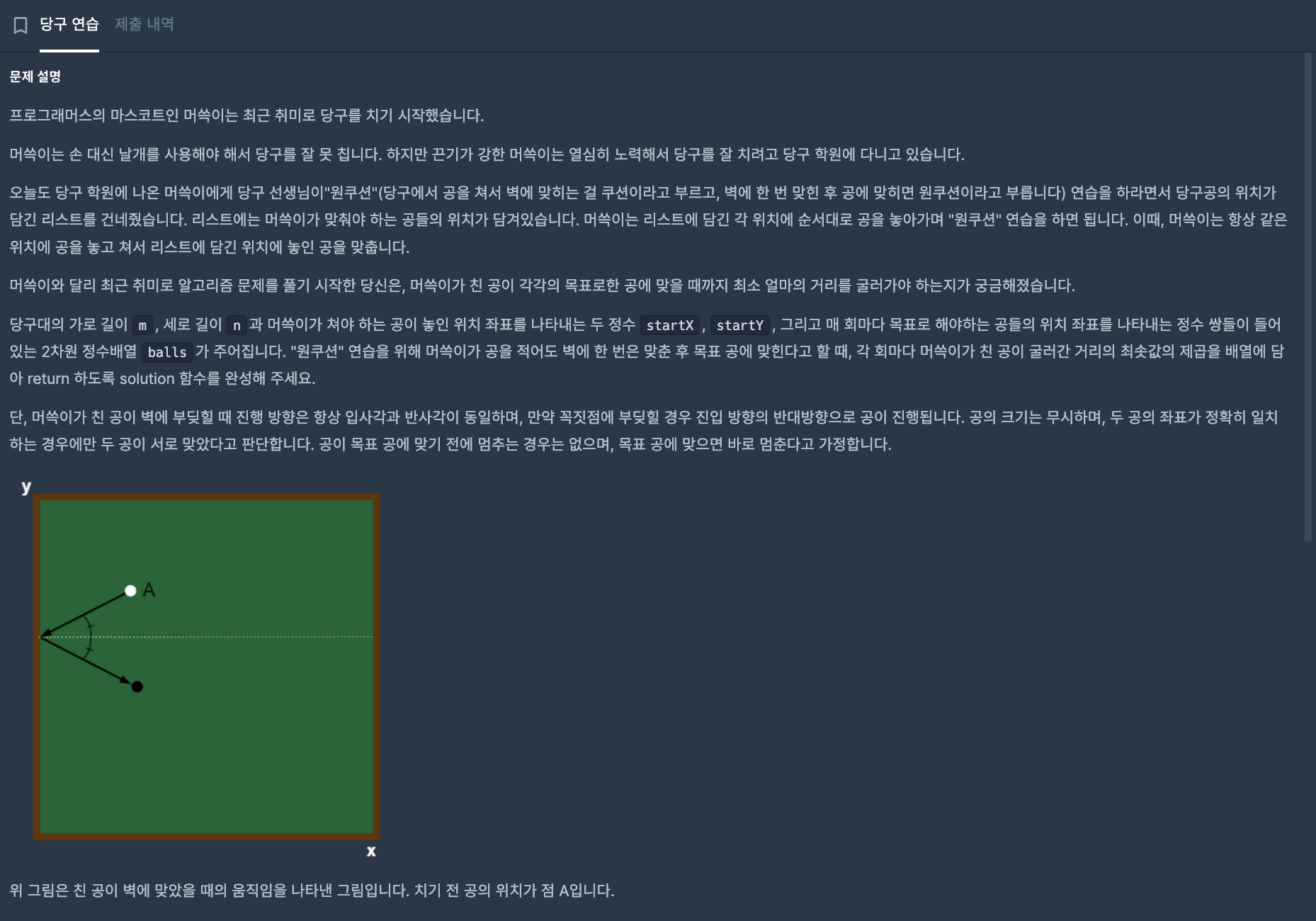 단, 머쓱이가 친 공이 벽에 부딪힐 때 진행 방향은 항상 입사각과 반사각이 동일하며, 만약 꼭짓점에 부딪힐 경우 진입 방향의 반대방향으로 공이 진행됩니다. 공의 크기는 무시하며, 두 공의 좌표가 정확히 일치하는 경우에만 두 공이 서로 맞았다고 판단합니다. 공이 목표 공에 맞기 전에 멈추는 경우는 없으며, 목표 공에 맞으면 바로 멈춘다고 가정합니다.