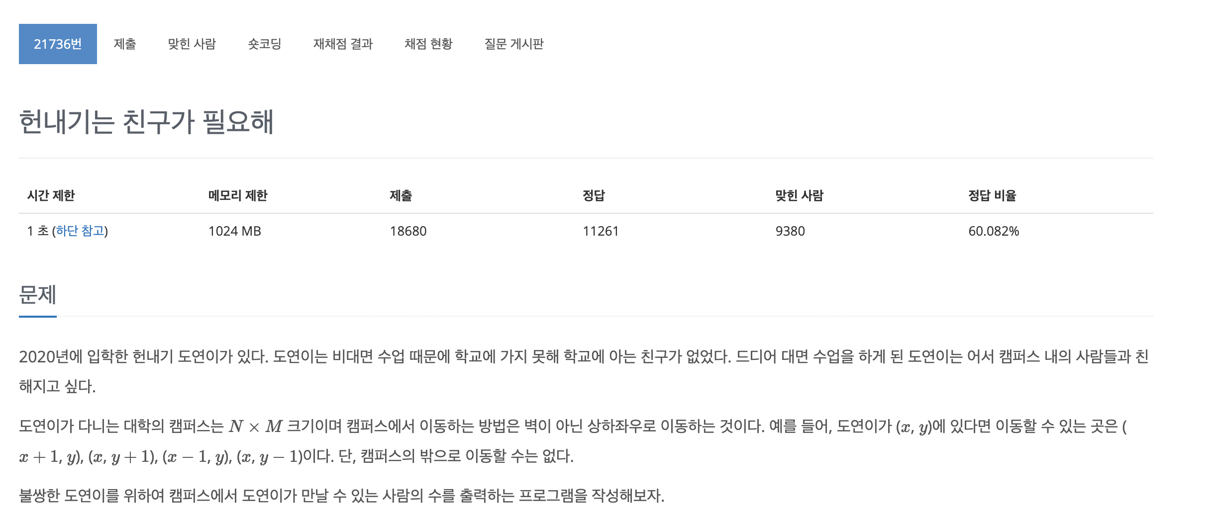 여기, 바로 그런 미스터리한 사건 파일이 하나 있다. 사건 현장은 백준 온라인 저지의 21736번 문제, "헌내기는 친구가 필요해"이다.