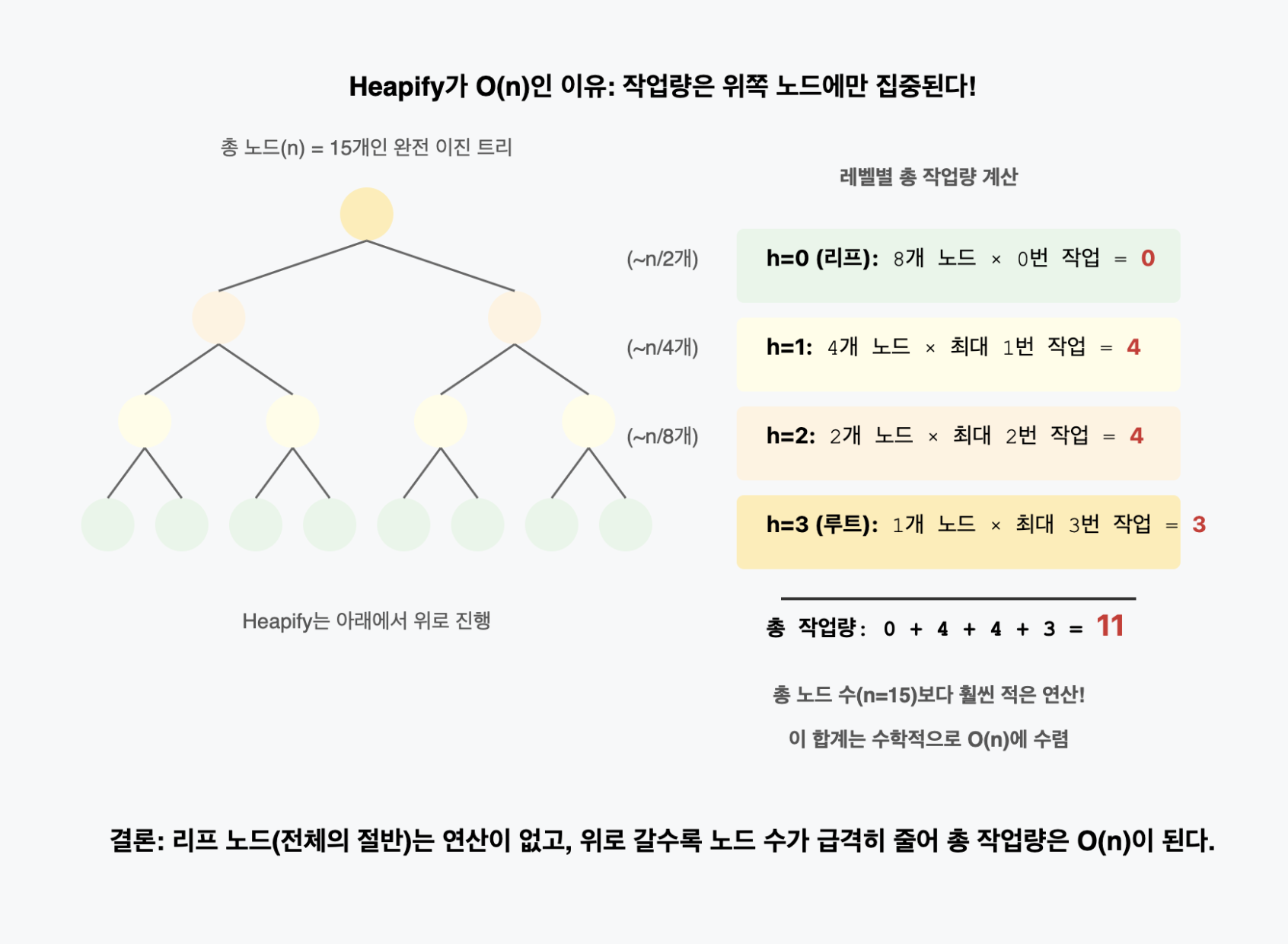 '힙 구성(Heapify) 단계가 왜 $O(n \log n)$이 아니고 $O(n)$이지?'라는 의문이 들 수 있다.