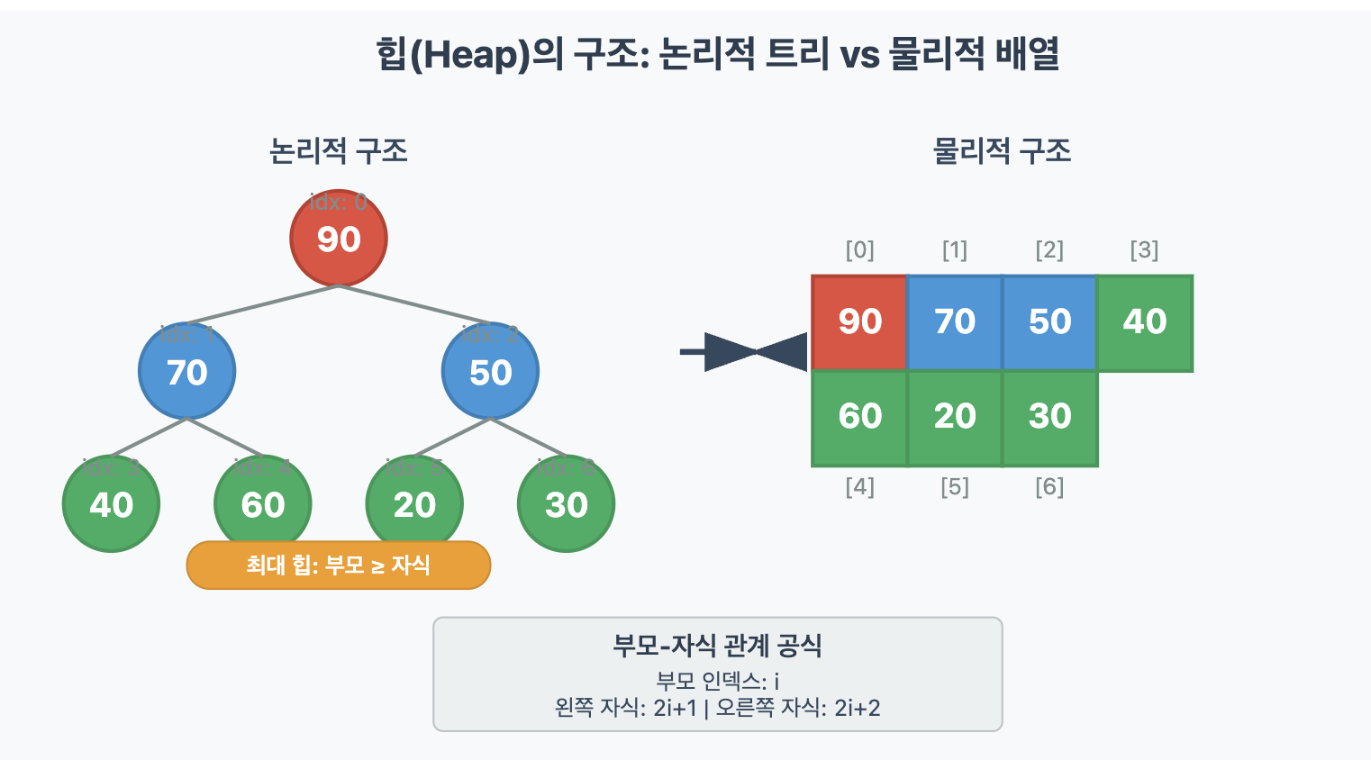 논리적으로는 완전 이진 트리(Complete Binary Tree) 형태를 가지지만 물리적으로는 배열을 사용해 매우 효율적으로 구현된다.
