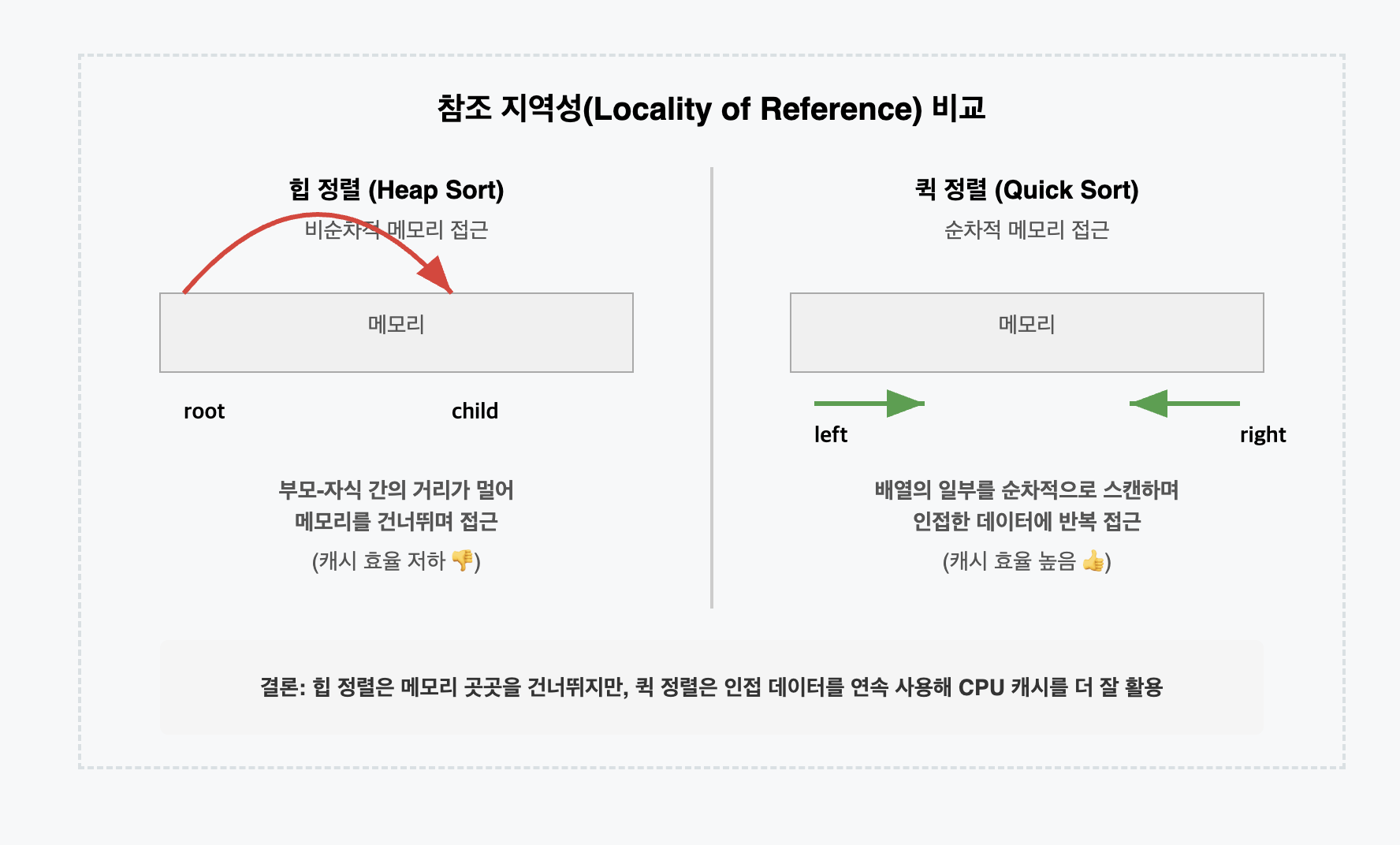 이론적인 시간 복잡도는 동일하지만, 실제 성능 테스트에서는 힙 정렬이 평균적으로 퀵 정렬보다 느린 경향을 보인는데, 가장 큰 이유는 참조 지역성(Locality of Reference), 즉 CPU 캐시 효율성 때문이라는 것이다.