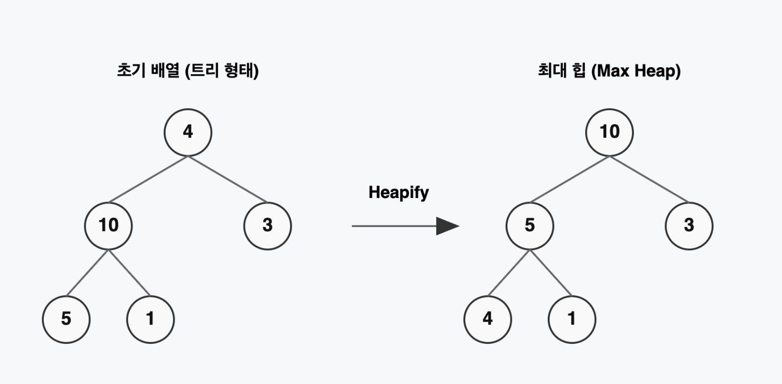 - 배열의 모든 요소를 힙의 규칙에 맞게 재배치하여, 가장 큰 '대장' 요소가 배열의 첫 번째 위치(루트)에 오도록 만든다.