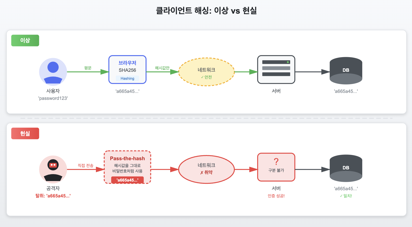 간단하고 그럴듯해 보입니다. 네트워크를 감청하더라도 원래 비밀번호는 절대 노출되지 않으니까요. 하지만 이 방식은 'Pass-the-hash' 공격이라는 치명적인 허점을 그대로 노출합니다.