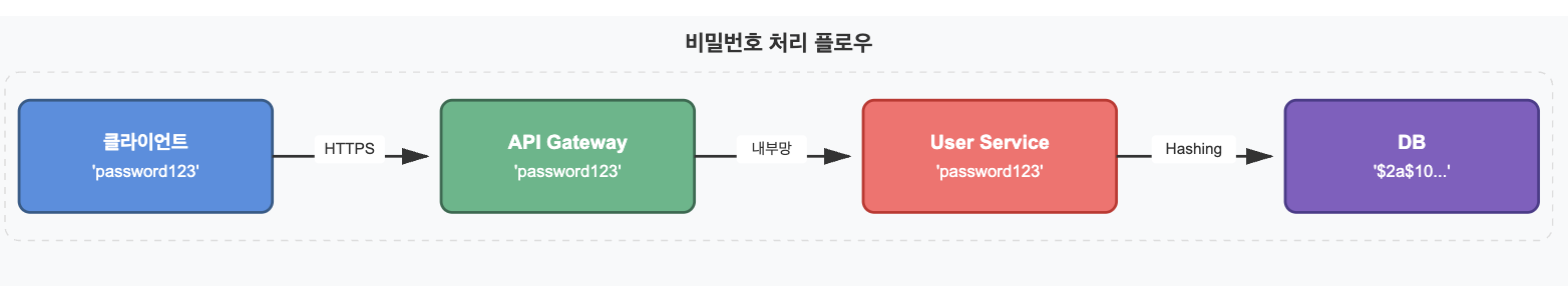 사용자가 입력한 비밀번호는 HTTPS를 통해 암호화되어 API 게이트웨이로 들어오고, 게이트웨이는 다시 내부망을 통해 인증을 담당하는 User Service로 요청을 전달합니다. 이 모든 과정을 거쳐 마침내 서비스의 메모리에 도달한 뒤에야, 비로소 비밀번호는 해시값으로 변환됩니다.