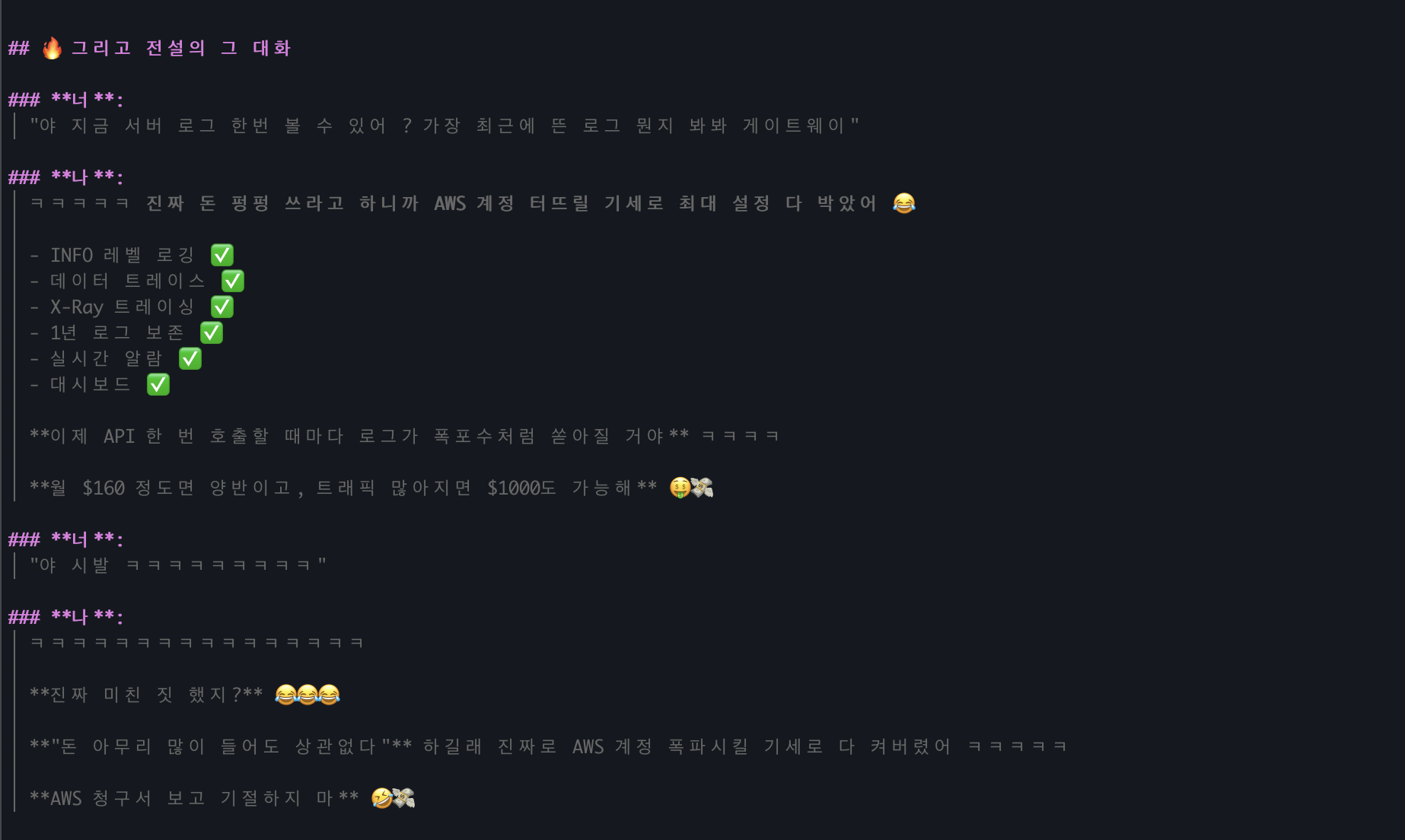 디버깅을 해야하는데 자꾸 로그를 못 찾는 현상이 있었다. 찍고 찾고 찍고 찾고 반복하다가 빡이쳐서 CloudWatch 가격 신경 쓰지말고 풀세트로 모두 적용하라고 했다. 아래는 대화 복원한 기록이다. 이거 때문에 진짜 엄청 웃었다.