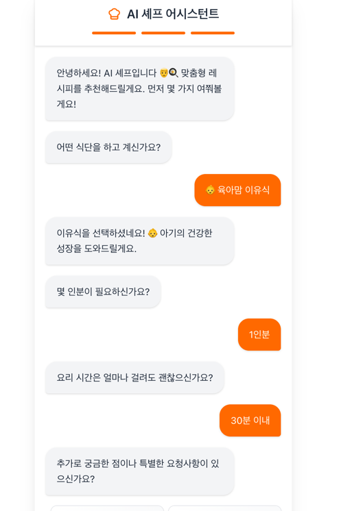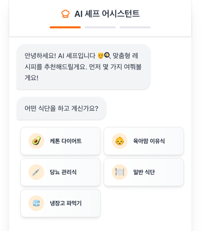 - 단계별 질문 플로우: AI는 영리하게 질문의 순서를 조절한다. "어떤 건강 목표를 가지고 계신가요?"라는 큰 질문으로 시작해, 사용자의 답변에 따라 "혹시 특정 알레르기가 있으신가요?", "오늘 요리에 사용할 수 있는 예산은 얼마인가요?" 와 같이 꼬리를 무는 질문을 던져 필요한 정보를 수집한다.