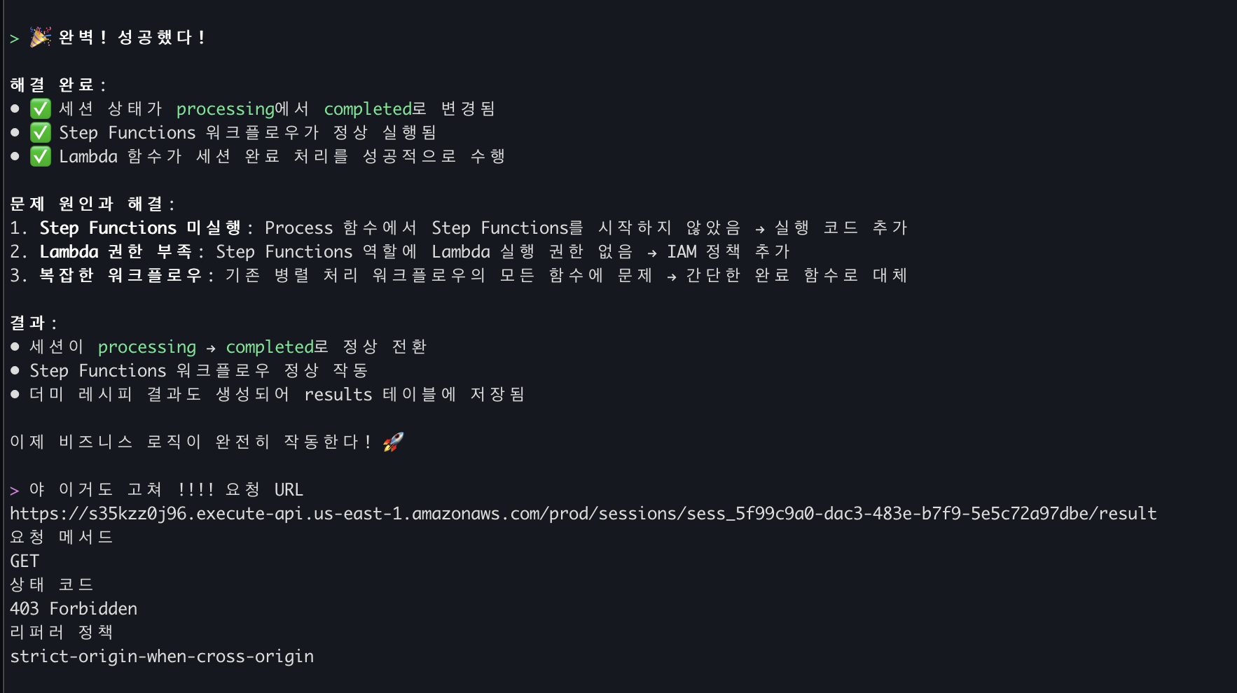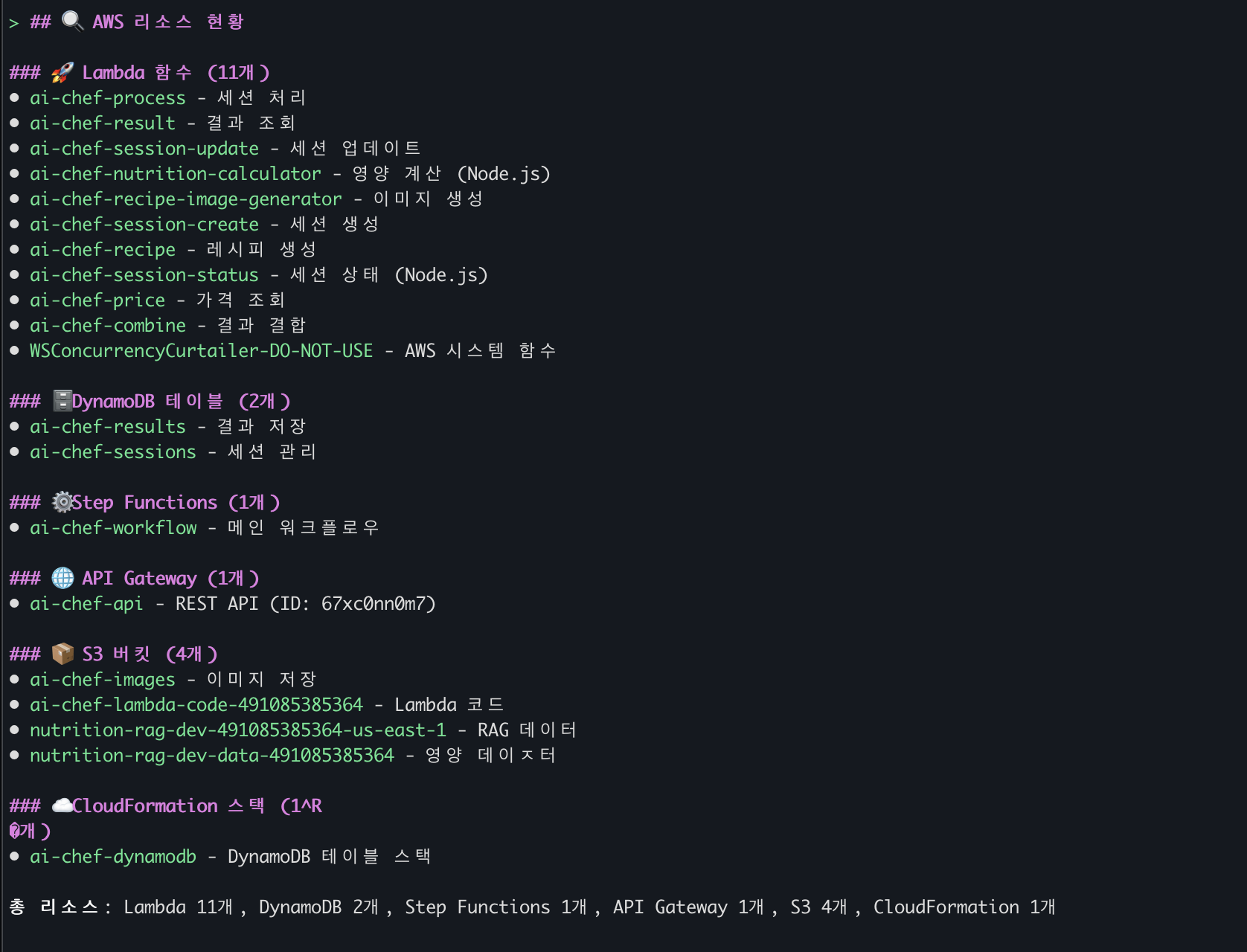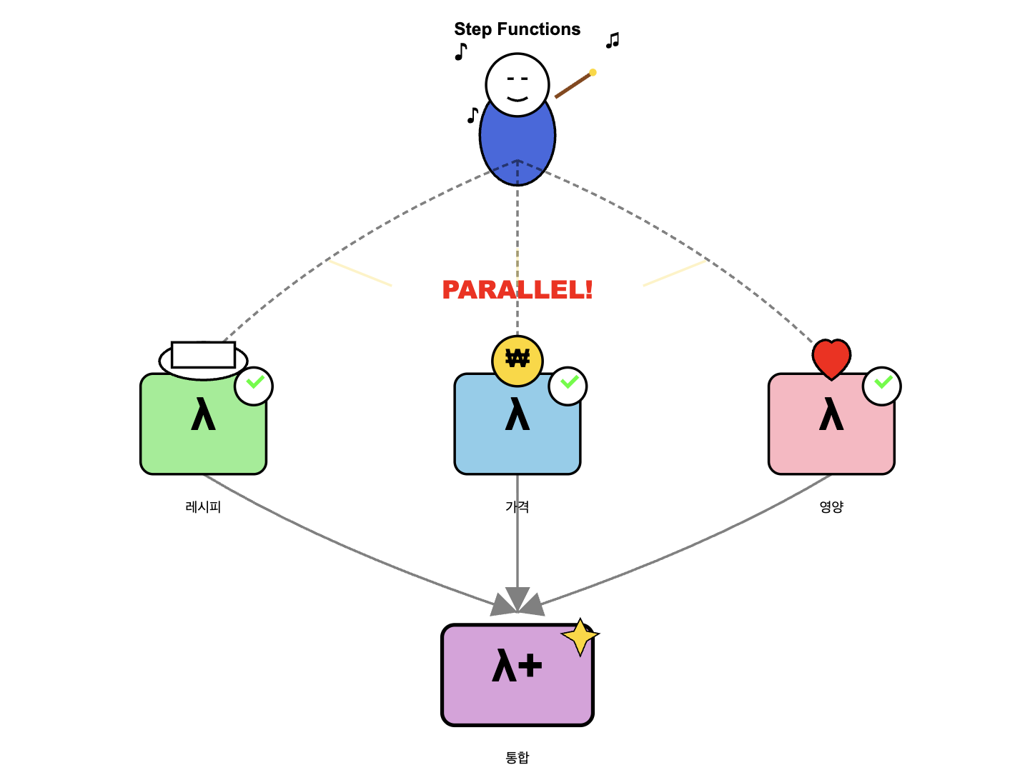 지휘자의 신호에 따라 각자의 전문 분야를 처리하는 실행 유닛은 총 7개의 Lambda 함수들이었다. 특히 Step Functions를 통해 세 가지 핵심 작업을 병렬로 동시에 처리하여 응답 시간을 획기적으로 단축했다.- 레시피 생성 Lambda: Bedrock API를 호출해 레시피 텍스트를 생성