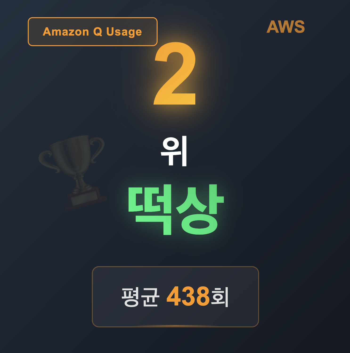 하지만 아주 예상치 못한 '상'을 하나 받았다. 바로 'Amazon Q 전체 사용량 2등'이었다. 처음에는 어리둥절했지만, 이내 그 의미를 깨닫고 헛웃음이 나왔다. 겉으로 보기엔 우리가 얼마나 처절하게 헤맸는지 보여주는 '삽질의 증거'처럼 보였다.