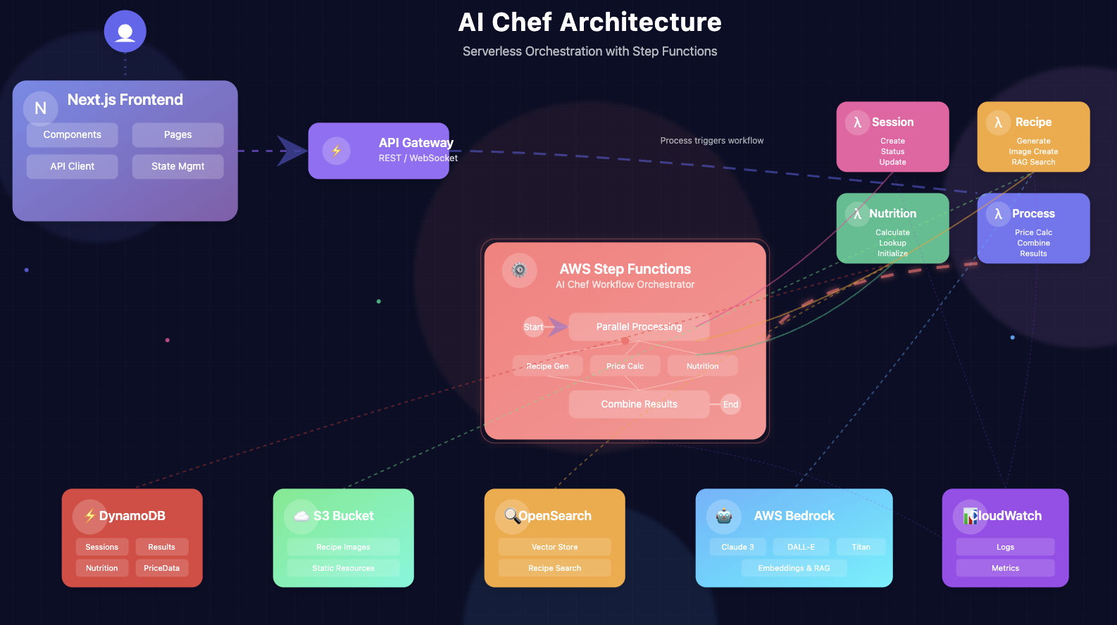 모든 작업의 흐름을 지휘하는 오케스트라의 지휘자는 Step Functions였다. 사용자의 레시피 생성 요청이 들어오는 순간, Step Functions는 복잡한 워크플로우를 시작한다. 각기 다른 역할을 수행하는 여러 Lambda 함수들을 동시에, 혹은 순서에 맞게 호출하며 전체 프로세스가 물 흐르듯 진행되도록 조율했다. - 전문가 (The Specialists) -