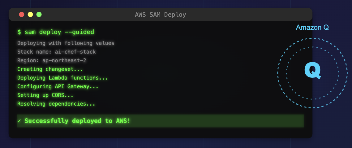 별 기대 없이 바라보던 화면에서, Q가 스스로 template.yml 파일을 생성하고, 우리 프로젝트의 복잡한 구조를 분석해 리소스를 정의하기 시작했다. 그리고는 우리가 지난 두 시간 동안 그토록 고통받았던 배포 과정을 거침없이 실행해나갔다.
