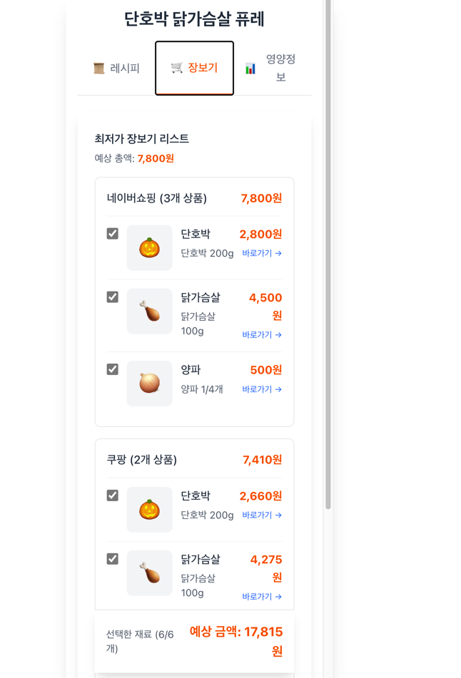 - 실시간 식재료 가격 분석: 저희 프로덕트의 핵심 기능이다. 네이버 쇼핑 API를 실시간으로 연동하여, AI가 제안한 레시피에 필요한 모든 식재료의 현재 최저가와 예상 총비용을 계산해 보여준다. 이를 통해 사용자는 예산에 맞춰 메뉴를 최종 결정할 수 있다.
