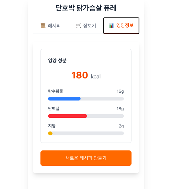 - 상세 레시피와 맞춤 영양 정보: 기본적인 조리법과 함께, 사용자가 설정한 목표(예: 케톤식)에 맞춘 칼로리, 탄수화물, 단백질, 지방 등의 상세 영양 성분 분석표를 제공하여 식단 관리의 효율을 높였다.