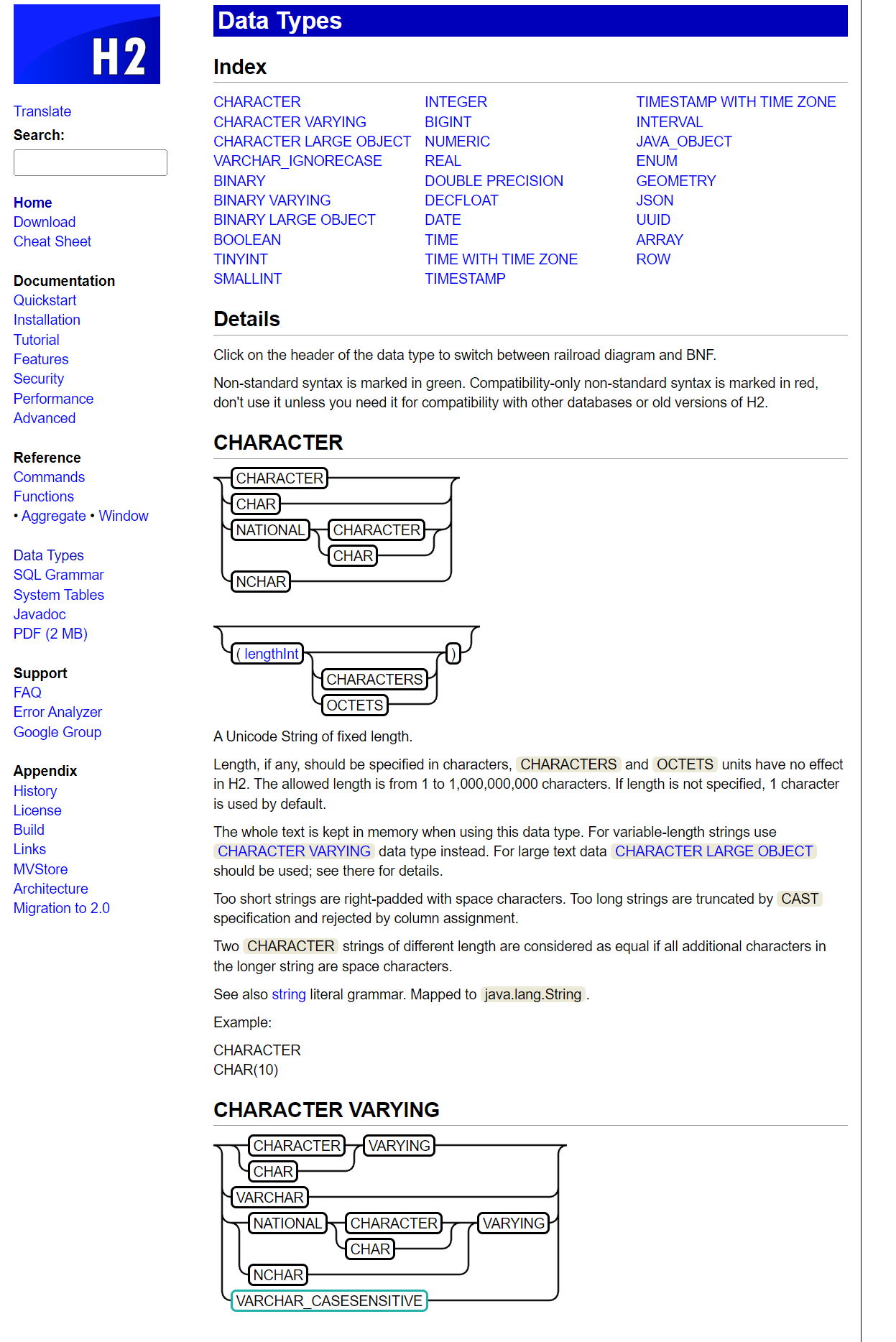 Data Types Index Details Click on the header of the data type to switch between railroad diagram and BNF. Non-standard syntax is marked in green. Compatibility-only non-standard syntax is marked in red, don't use it unless you need it for compatibility