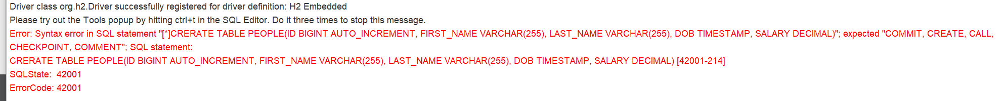 CRERATE TABLE PEOPLE(ID BIGINT AUTO_INCREMENT, FIRST_NAME VARCHAR(255), LAST_NAME VARCHAR(255), DOB TIMESTAMP, SALARY DECIMAL);
