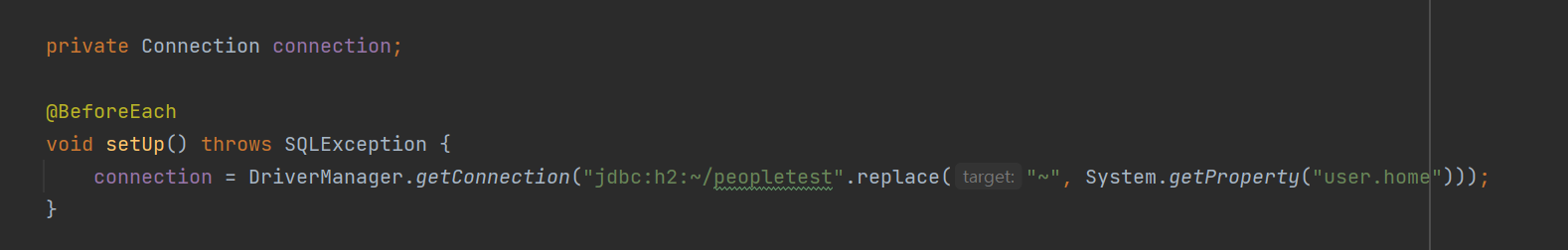 connection = DriverManager.getConnection("jdbc:h2:~/peopletest".replace("~", System.getProperty("user.home")));